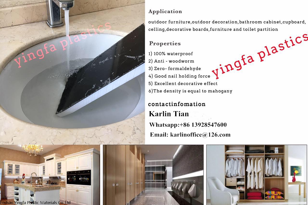 Yingfa PVC furniture board, its chemical composition is polyvinyl chloride Composite with some New Environmental Protection Materials, Widely used in industries such as ceiling of buses, train cars, box core, interior panels, building wall panels, decorative panels, office, residential, public building, commercial decorative frame, clean room plate, ceiling panels, screen printing, computer lettering, advertising, labeling, display panels, signs with the board and albums board and chemical corrosion engineering, thermoformed parts, refrigerator with panels, special cold project, environmental used formwork, sports equipment, breeding material, waterfront facilities, moisture materials, art materials and a variety of portable partitions instead of the glass ceiling and so on.